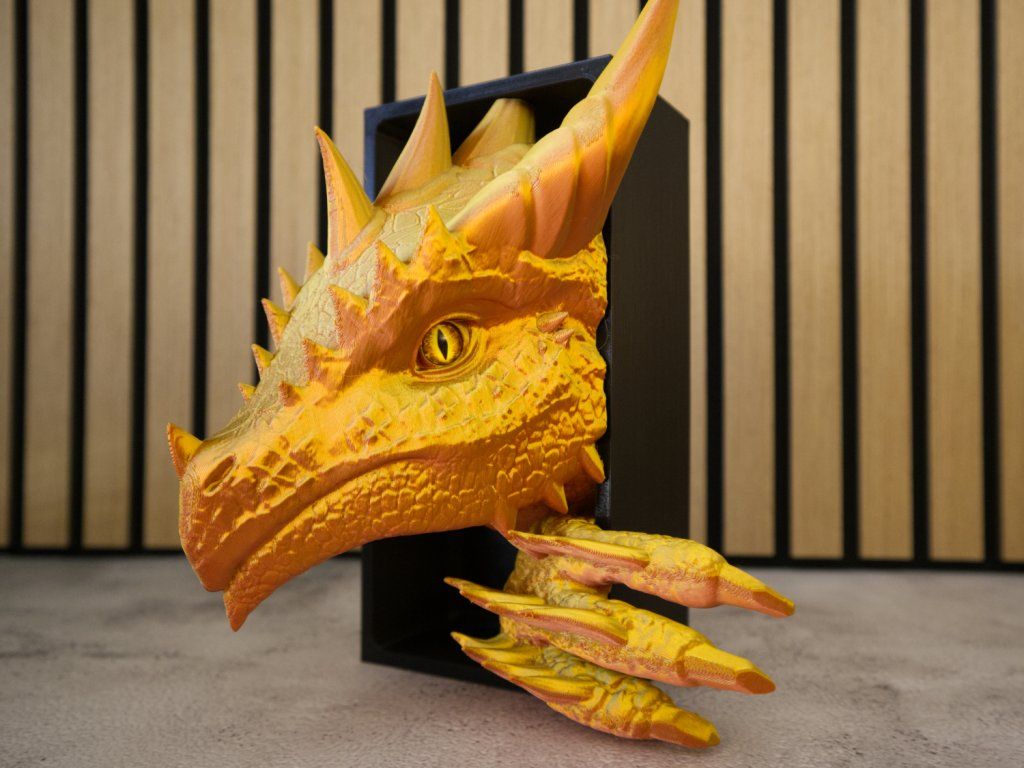 Máte pocit, že vaša knižnica potrebuje niečo skutočne veľkolepé? Náš Book Nook vnesie do vašej zbierky energiu drakov, ktorí vládnu ohňu. Tento majestátny drak s prenikavým oranžovým okom je vytlačený z prémiového dvojfarebného materiálu SILK PLA, ktorý v sebe snúbi luxusnú zlatú a hrejivú medenú.